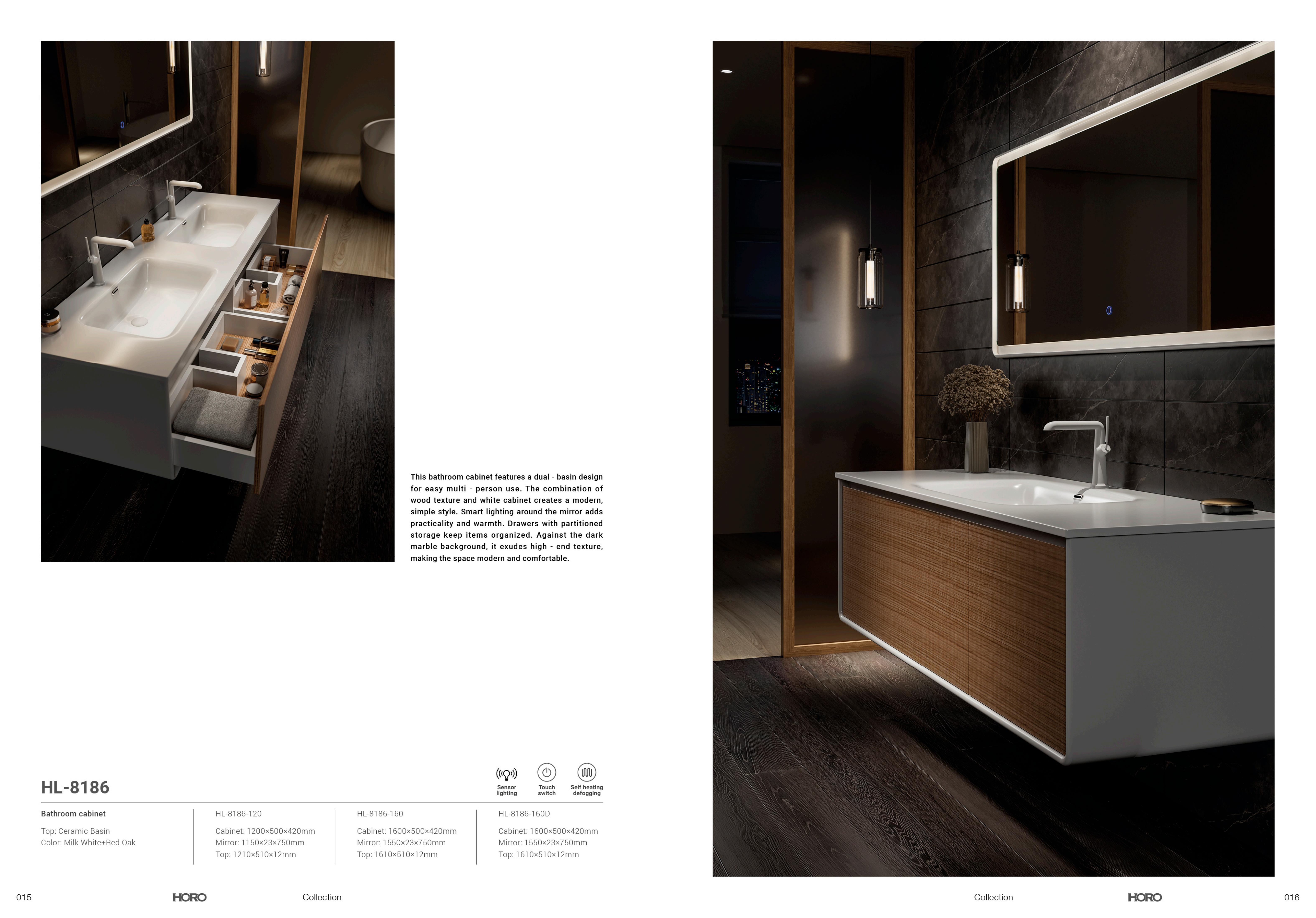 This bathroom cabinet features a dual - basin designfor easy multi-person use. The combination ofwood texture and white cabinet creates a modernsimple style. Smart lighting around the mirror addspracticality and warmth. Drawers with partitionedstorage keep items organized. Against the darkmarble background, it exudes high -end texturemaking the space modern and comfortable.
